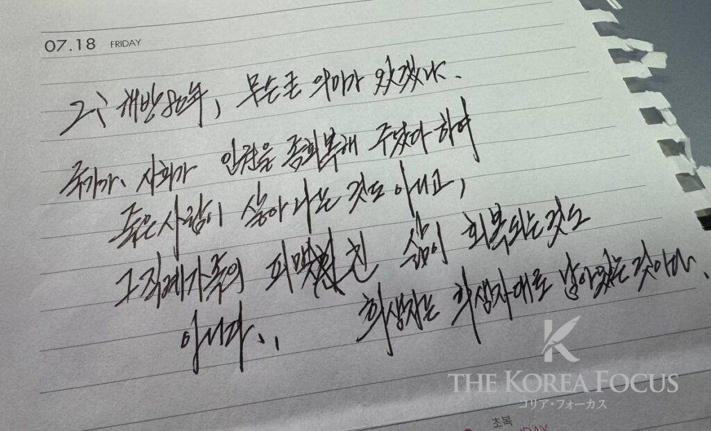 그러면서 이때, 병석에 누워 있던 장인어른에게 “올 해 해방 80년을 어떻게 받아들였는지”를 물어보았다. 질문을 자세히 적어 건넨 다음 날, 성실한 장인어른은 빽빽하게 글씨를 채운 3장의 메모지를 줬다.